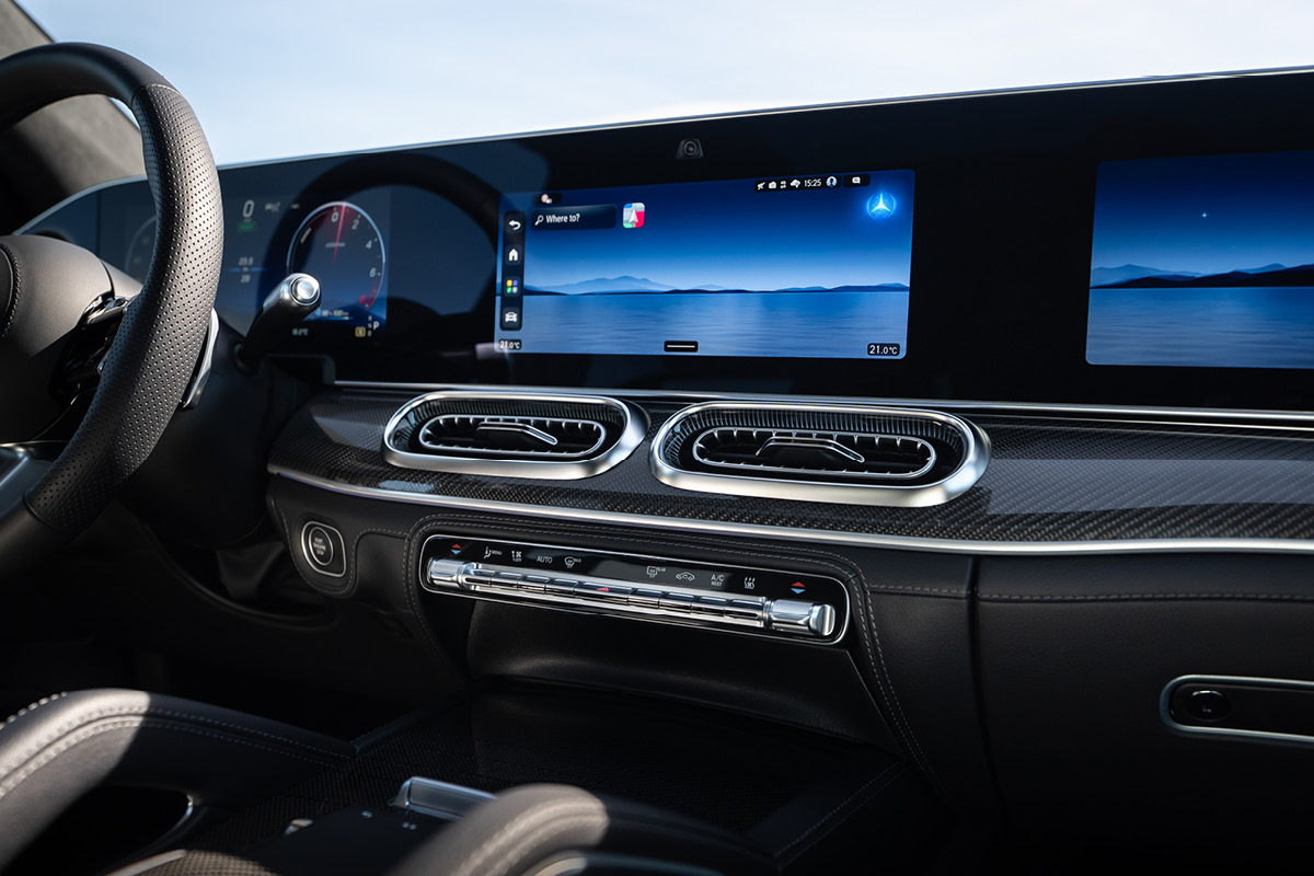 Das Lenkrad der neuesten Generation verfügt über Sensorflächen auf den Speichen, mit denen Fahrer das Fahrer- und Zentral-Display per Touch-Bedienung steuern können – ohne die Hände vom Steuer zu nehmen. Die Chromeinfassungen der mittleren Lüftungsdüsen (zuvor dem Maybach GLS vorbehalten) setzen edle Akzente.